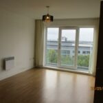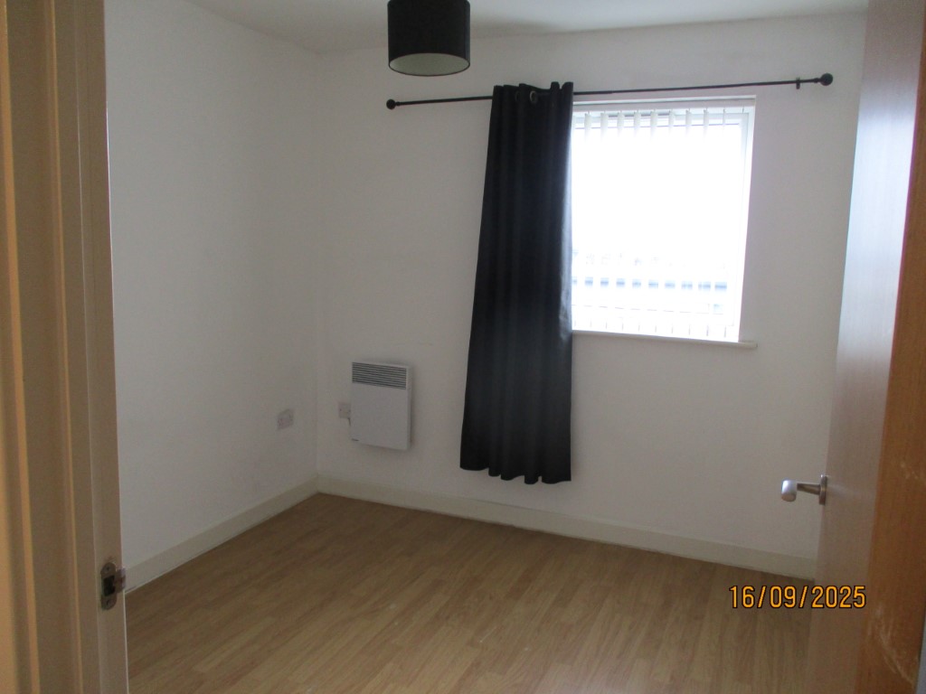 White walls. White ceiling. Central light fitting. UPVC window. Beige wooden flooring. Wall mounted electric heater.
