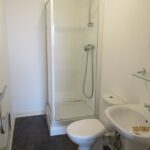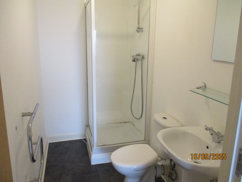 Step in shower cubicle. White pedestal sink with mixer tap. White low level toilet. Wall mounted mirror. Wall mounted glass shelf. Black lino flooring. Central light fitting with extractor fan when light comes on.