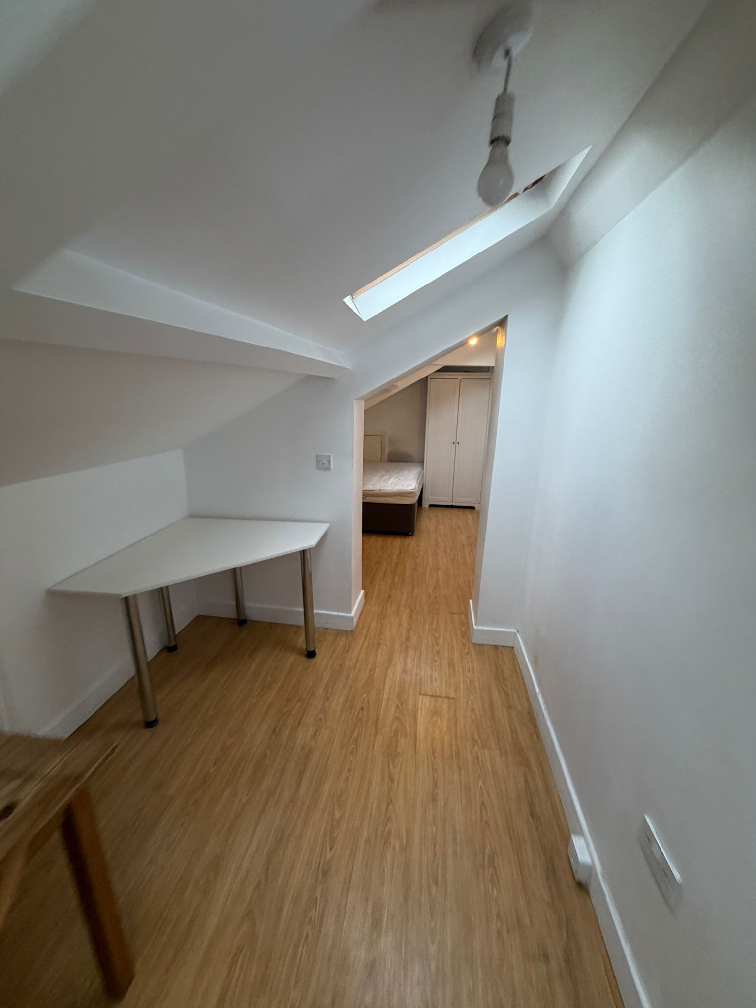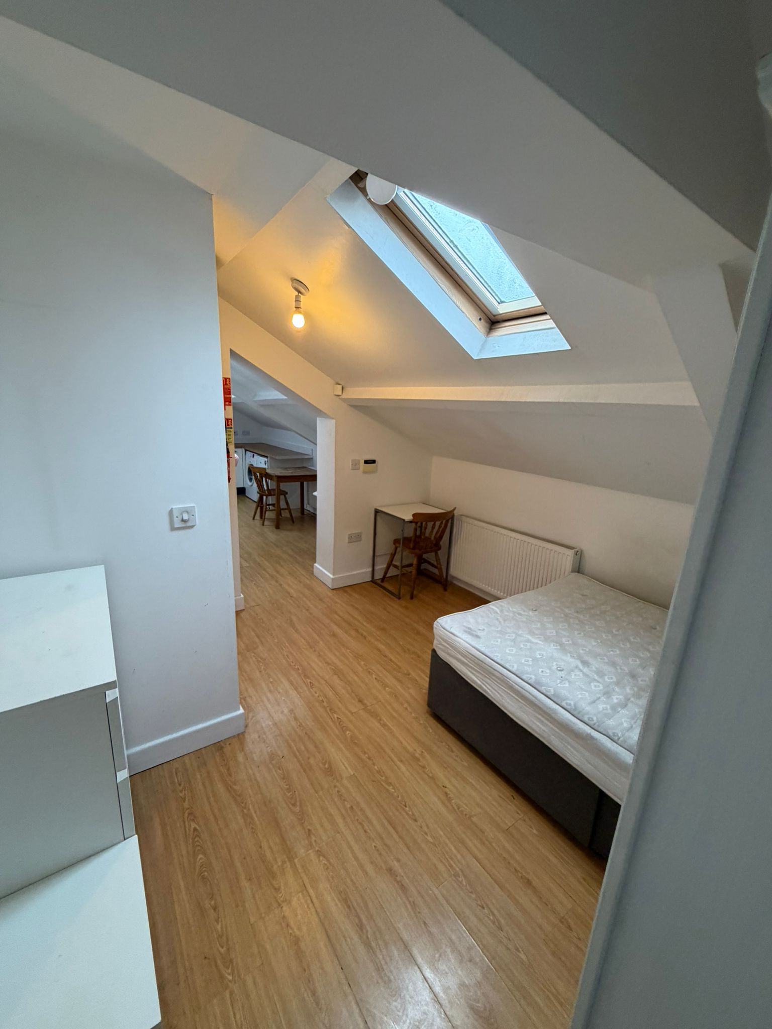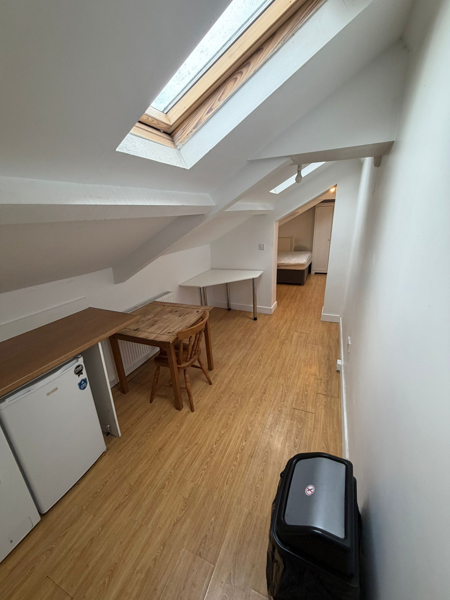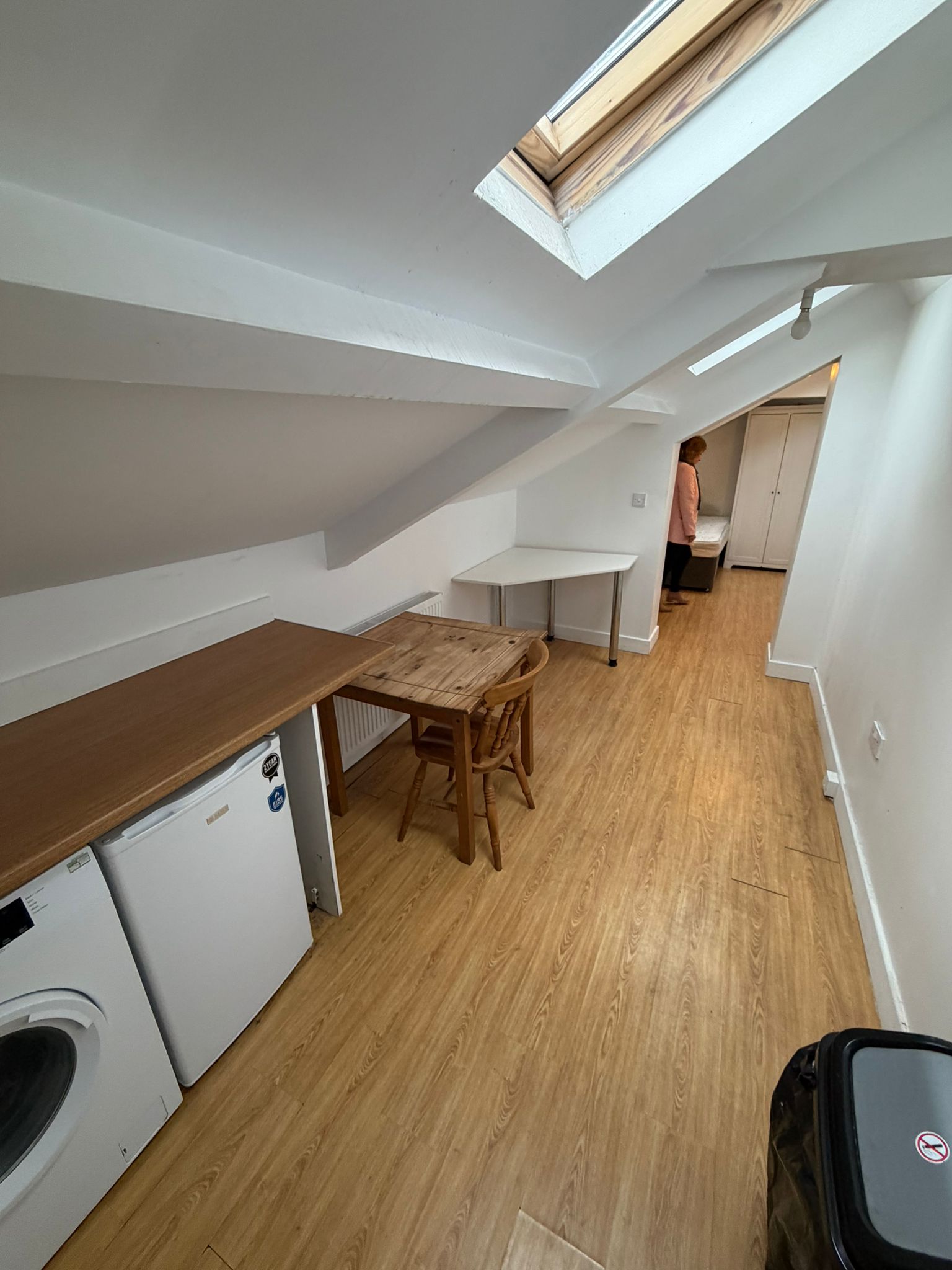 This larger top floor studio flat benefits from an increased floor area and multiple skylights, allowing plenty of natural light throughout the living space.The property is accessed via a communal entrance and has its own private front door. Internally, the studio offers a generous open plan living and kitchen area, making it ideal for one or two occupants. The fitted kitchen includes an electric hob, fridge freezer, washing machine, sink and storage units.The private shower room is fitted with a shower, toilet and wash basin. The flat is furnished and offers a practical layout with defined living, sleeping and workspace areas. Available immediately. Suitable for up to two occupants.