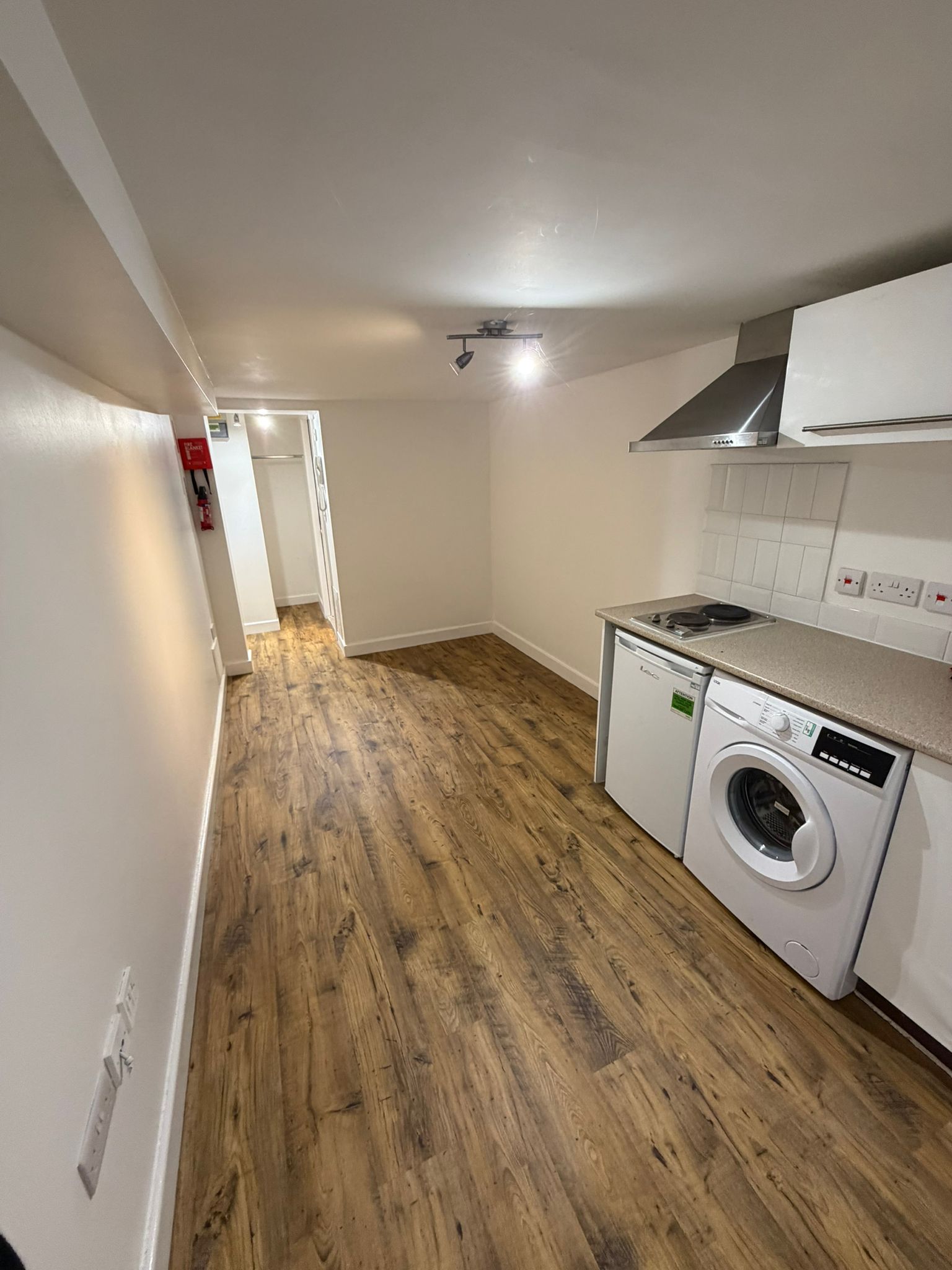 The fitted kitchen includes a two ring electric hob, fridge freezer, microwave, washing machine, sink, and storage units, making the space practical for everyday living.