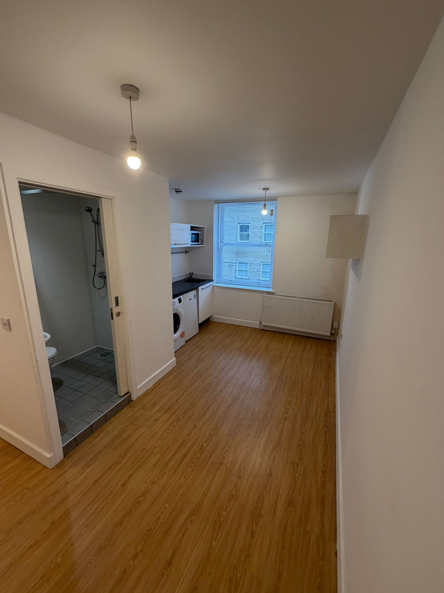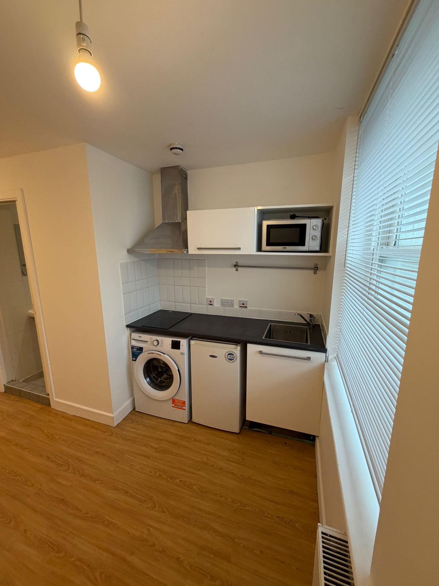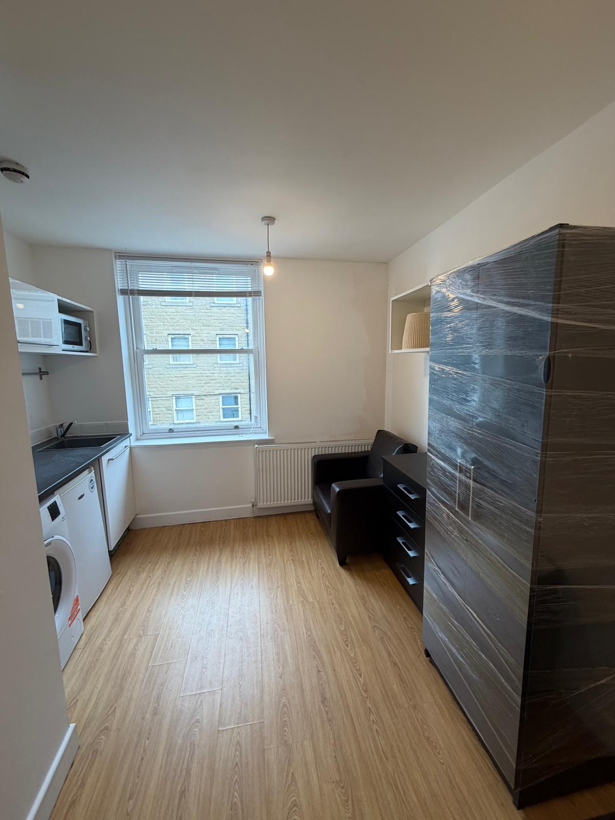 Flat 13 at 16–18 Bath Street is a compact studio flat, ideally located close to Huddersfield town centre and local amenities.The property is accessed via a communal entrance, with the added benefit of its own private front door leading directly into the studio. Inside, the open plan living and kitchen area is neatly laid out and comes fully furnished, including a bed, wardrobe, table and chair.The fitted kitchen includes a two ring electric hob, fridge freezer, microwave, washing machine, sink, and storage units, making the space practical for everyday living.The private bathroom is fitted with a shower, toilet, and wash basin, finished to a clean and functional standard.This studio is offered fully furnished, is available immediately, and is suitable for single occupancy only.