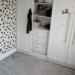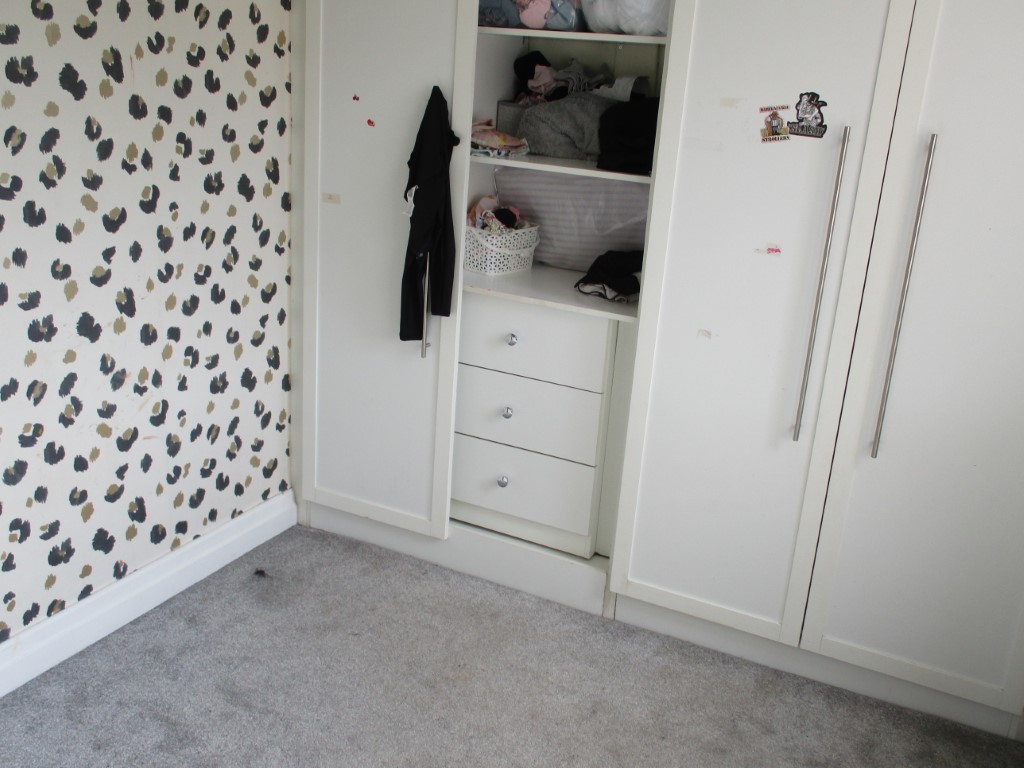 1 feature wallpaper, grey walls, white ceiling, UPVC window to rear, wall mounted radiator, fitted wardrobes, central light fitting, grey carpet