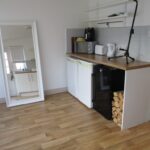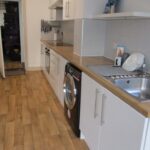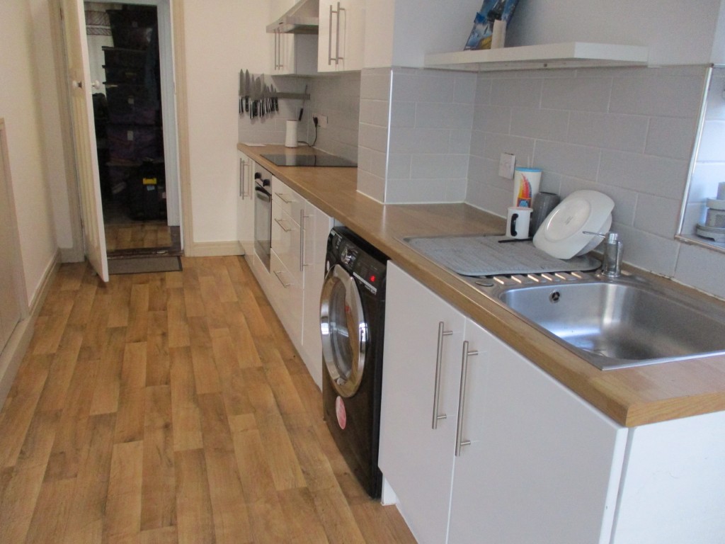White ceiling, white walls, brown laminate flooring, wall mounted radiator, grey tiles, white wall mounted kitchen cabinets, brown wooden work tops, ceramic hob, silver basin and tap, built in storage cupboard, extra built in kitchen cabinets and work top, central light fitting, door to rear garden, white double glazed UPVC windows,